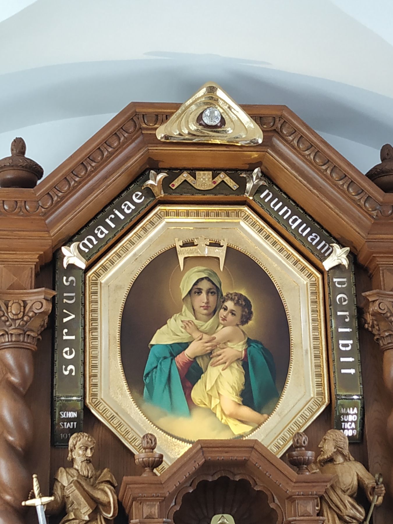 Schwester M. Roseli hat es für uns sehr schön in echter Handarbeit angefertigt, genau nach der Form des Vatersauges im Urheiligtum.