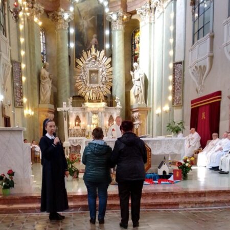 Sr. Erika-Mária Bukovics führt als Moderatorin in das Tagesprogramm ein. Wie in dieser Diözese üblich, finden alle Programmpunkte in drei Sprachen statt: Rumänisch, Ungarisch und Deutsch. Zur Einstimmung werden alle durch ein kurzes Video auf eine virtuelle Weltreise mitgenommen zu allen Filialheiligtümern der Welt. Am Schluss sieht man den Heiligtumsaltar im Haus der Schwestern in Temeswar mit der Frage, die in vielen Herzen brennt: Wann und wo wird das erste Heiligtum in Rumänien stehen?