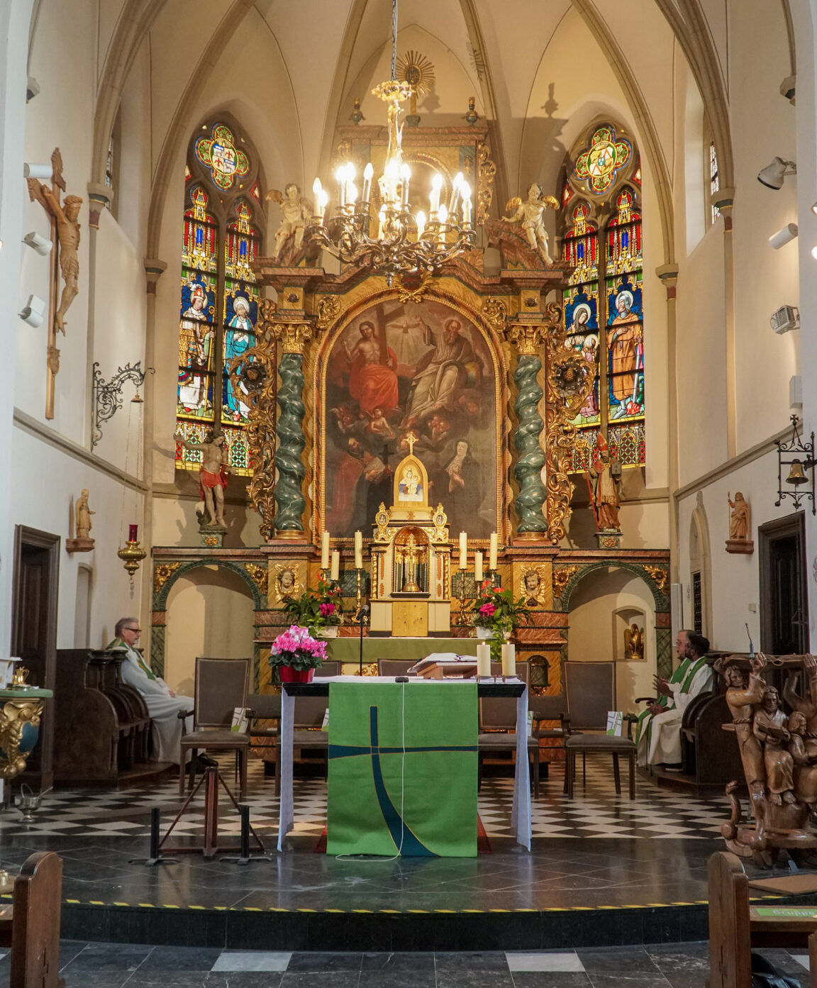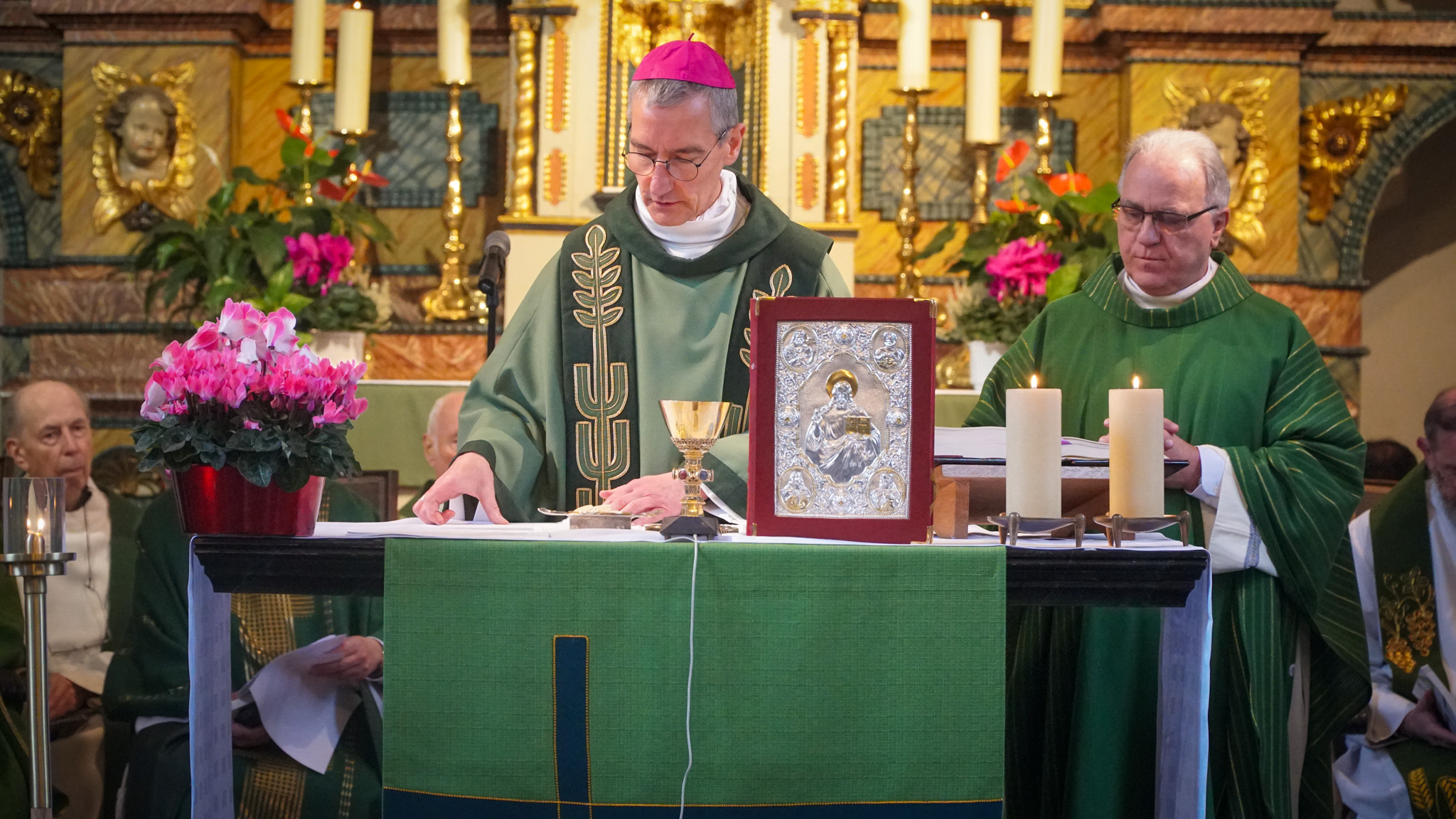 An diesem Sonntagmorgen finden sich außer der hiesigen Pfarrgemeinde Mitglieder der Schönstattfamilie aus der näheren und weiteren Umgebung zum Festgottesdienst in St. Kunibert ein. Sogar eine Busgruppe aus Brasilien ist darunter. Es ist eine besondere Ehre, dass Erzbischof Vincent Dollmann aus Cambrai in Frankreich die Einladung angenommen hat und als Hauptzelebrant der Festmesse vorsteht. Unter den Konzelebranten sind Pastor Hans-Peter Kippels, leitender Pfarrer der Pastoralen Einheit Erftstadt, Pastor Joseph Pikos, Pfarrvikar in Gymnich, sowie mehrere Schönstattpatres und -priester aus verschiedenen Ländern. Sie werden beim festlichen Einzug begleitet von einer Abordnung der hiesigen Schützenvereine. Der Chor „Neue Wege“ unter der Leitung von Johannes Speckamp gestaltet die Heilige Messe professionell mit schwungvollen Liedern, die die Freude am Glauben zum Ausdruck bringen.