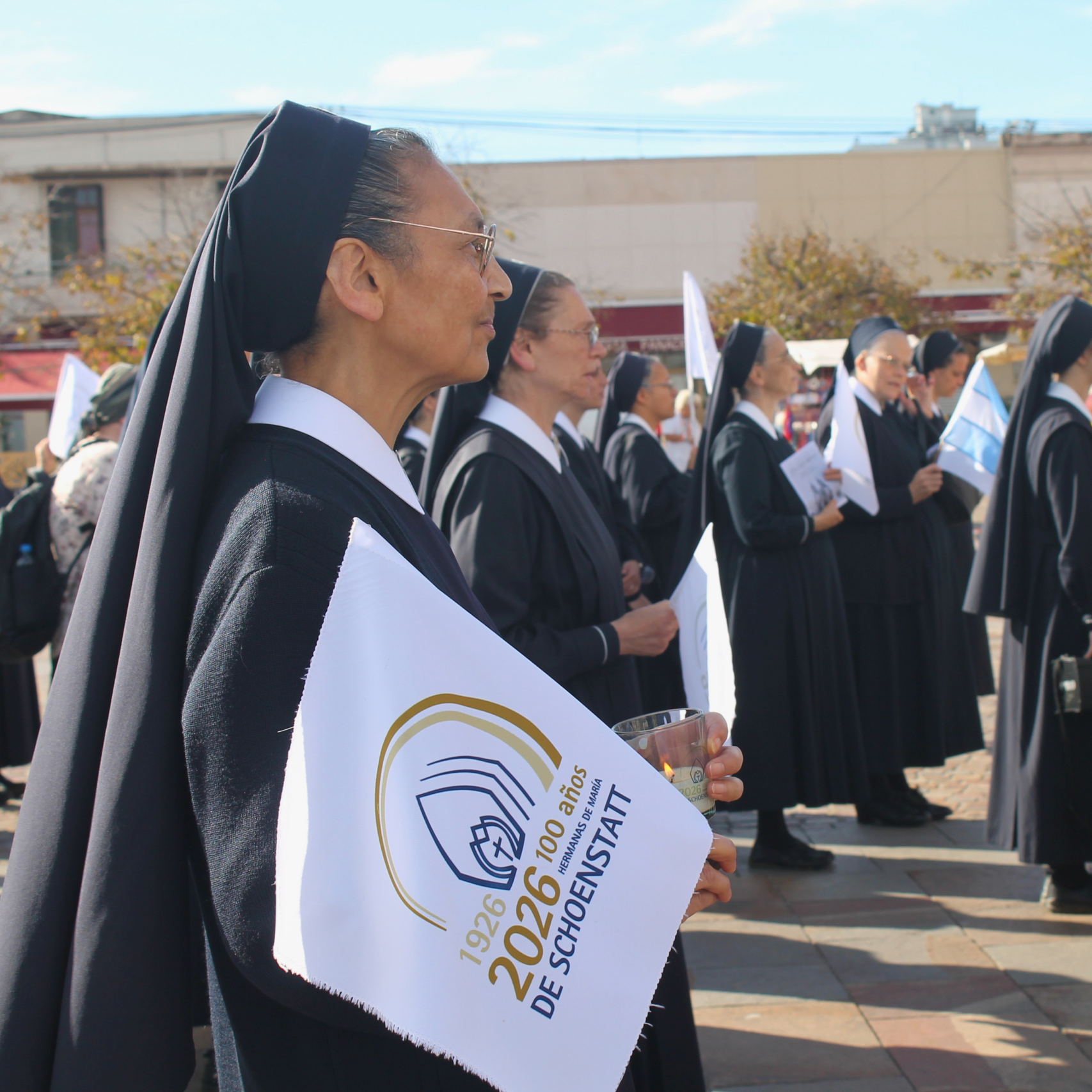 Sehr früh machten wir uns auf den Weg nach Luján. Wir wollten Heiligtum mit Heiligtum verbinden, indem wir von Nuevo Schoenstatt und von unseren Zentren in Buenos Aires aus aufbrachen und – etwa siebzig Schwestern – auf der Straße zusammenkamen, die zur Basilika führt. Auf diese Weise griffen wir den Auftrag unseres Vaters und Gründers auf: Er sagte gerade in Luján, bei seinem ersten Besuch im Nationalheiligtum am Montag, dem 9. Juni 1947: