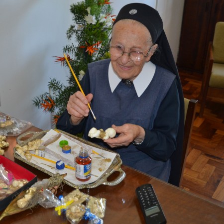 The figures are finished with much hand work. Sister M. Leocádia first pours the form, allows the figures to dry, files the edges, polishes and paints them. Then come the decorative nuances: she glues the figures on a star, a piece of tree bark, or a candle. After this, she packs them individually or with Mary and Joseph as the Holy Family. The entire work is accompanied with prayer and a conversation with the Christ Child. With childlike joy, she who is 80 years old tells us: “During the work I speak with each one and call them my ‘little friend.’ And I tell them that now they will bring the grace of salvation to humanity from the shrine. I enjoy what I am doing very much!”