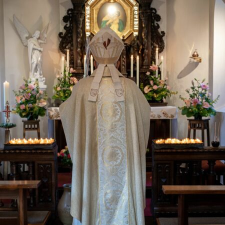Auxiliary Bishop Dr. Christoph Hegge of Munster is the presider. Pastor Andreas Hageman, the diocesan president of the Schoenstatt family of Munster, and Deacon Klau Tebruegge from Bocholt, who likewise belongs to the Schoenstatt Movement, process with the bishop in the solemn liturgy. Banner carriers and altar servers precede them. Members of the Borken Brass Orchestra, the organist Stefan Lemanski, and a small choir of sisters contribute to the festive arrangement.