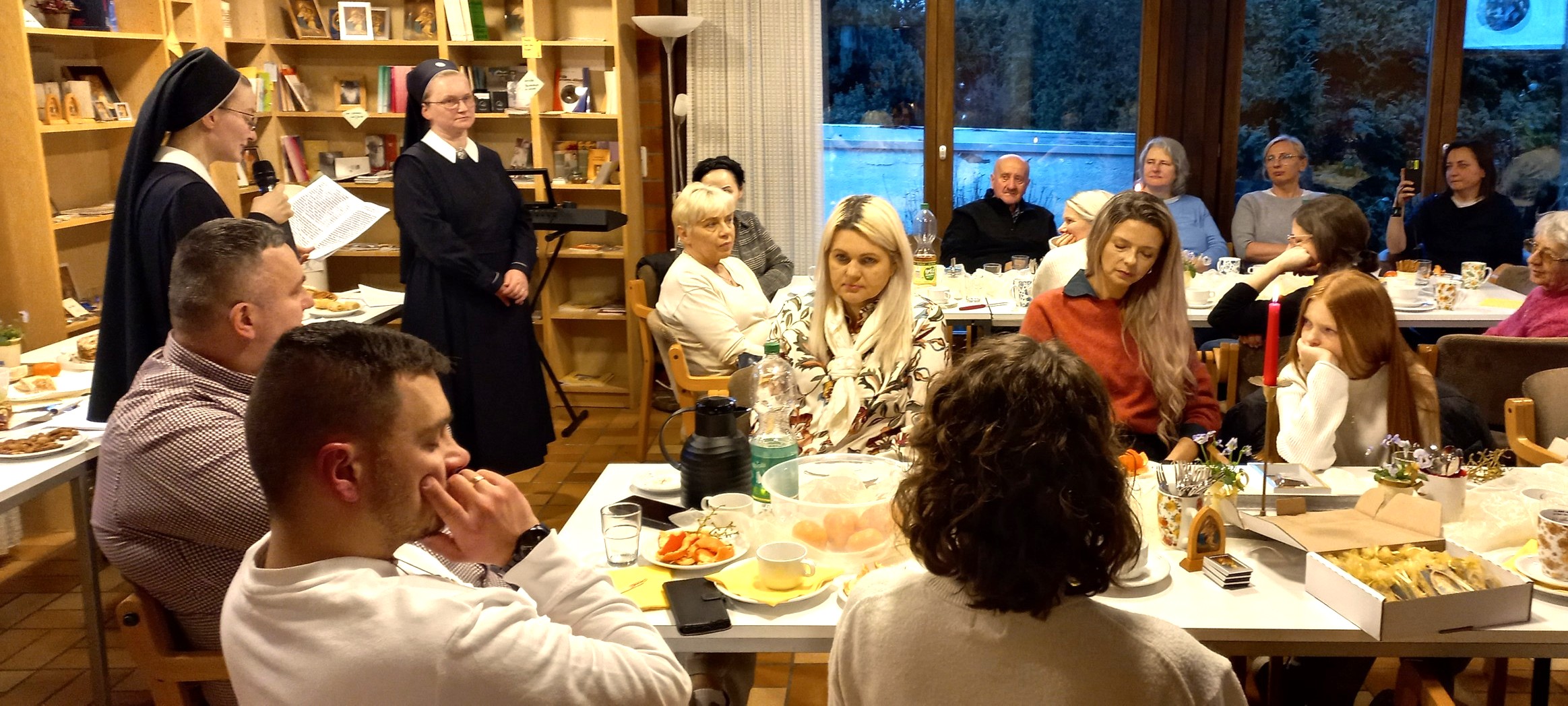 Después de la Santa Misa, el matrimonio Weidtmann invitó a todos a continuar el encuentro y la celebración en la Casa Padre Kentenich. Allí ya estaba preparado un maravilloso buffet jubilar, preparado con esmero por los participantes de la misión polaca. Como un verdadero momento destacado del programa, se percibieron los testimonios personales de la Hna. M. Antonia y de la Hna. M. Małgorzata: ejemplos impresionantes de que Dios acompaña cada camino con paciencia y amor.