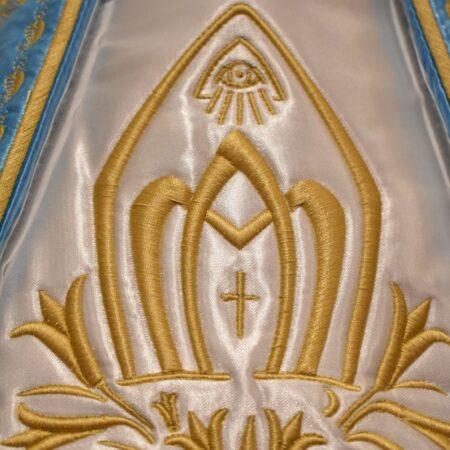 Ha sido un delicado detalle de la providencia que pudimos entregarle su nuevo y hermoso vestido, confeccionado por las Hermanas Carmelitas que viven junto al Santuario. El mismo lleva bordado un símbolo que nos identifica: el Santuario, con el símbolo del Padre; en su interior la sigla MTA en la que está integrada la cruz, tal como está expresada en el monograma que llevamos en el velo y azucenas que custodian el Santuario.