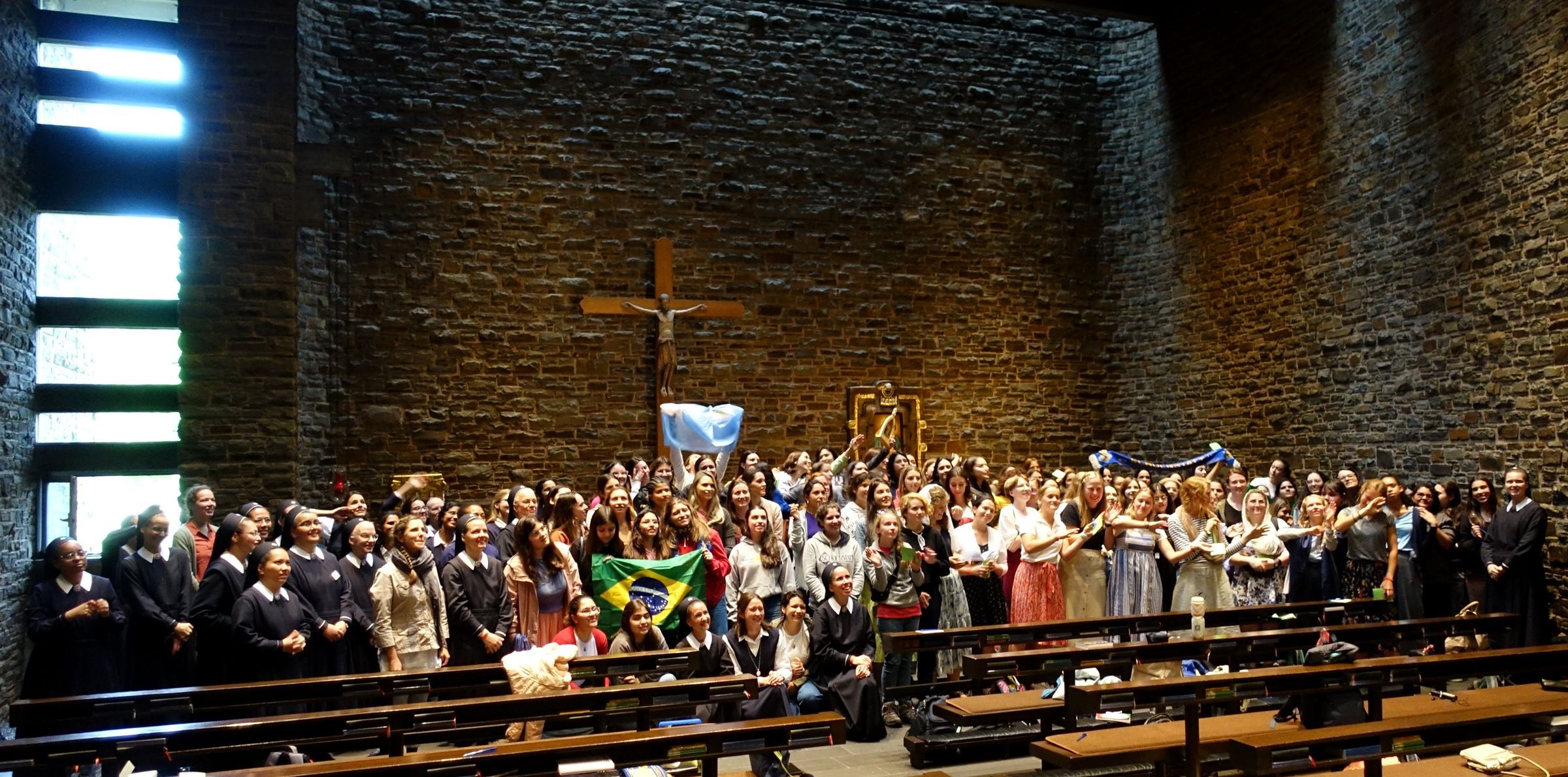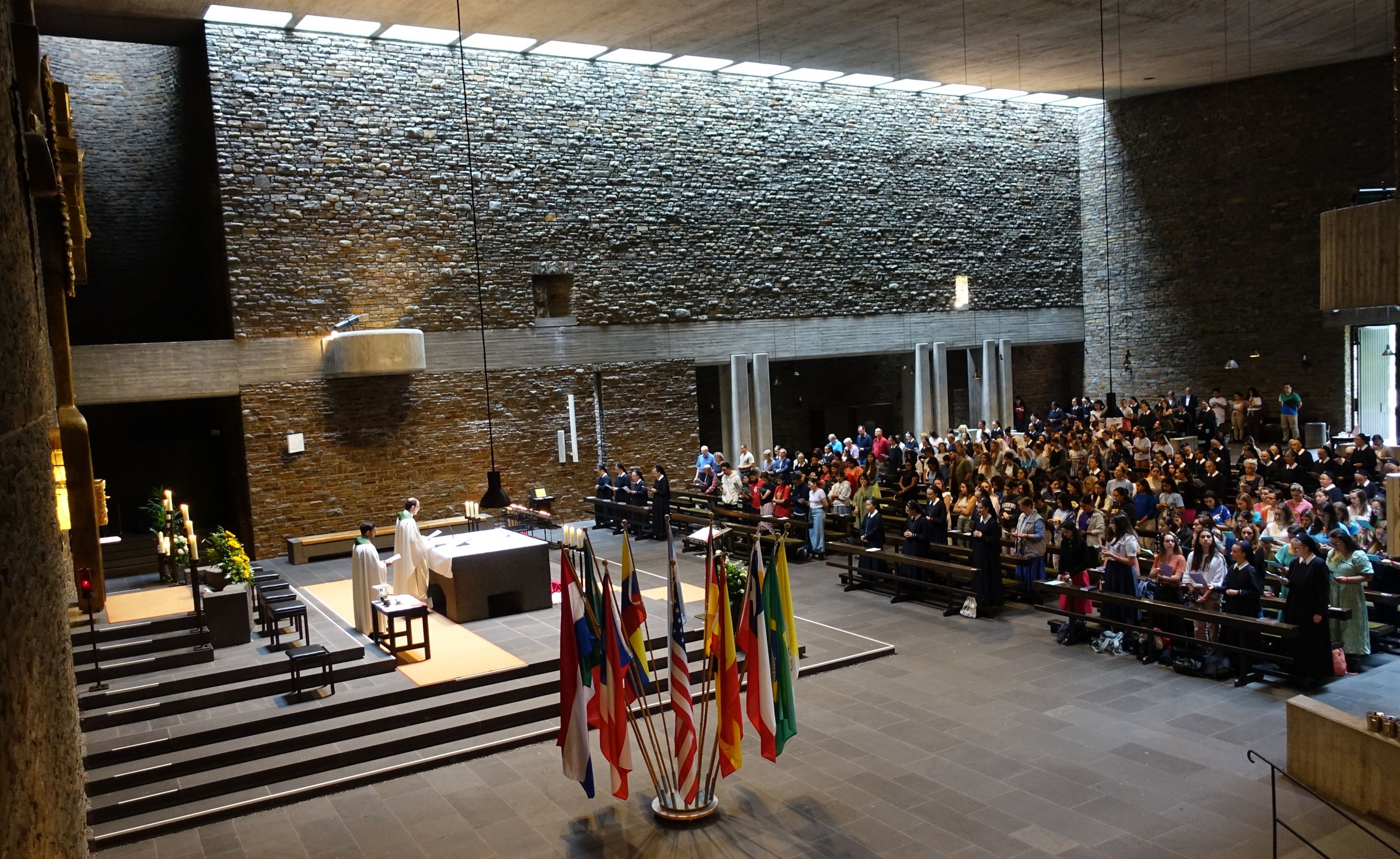 Domenica 23 giugno, noi suore abbiamo invitato i giovani a iniziare la giornata con la Santa Messa, alle ore 9:00, nella Chiesa dell’Adorazione, sul Monte Schönstatt. Le nostre postulanti hanno preparato la Messa, nella quale Padre Mello è stato il celebrante principale. Tutte le preghiere, i canti e i testi si sono alternati in diverse lingue, il che ha dato un senso di internazionalità.